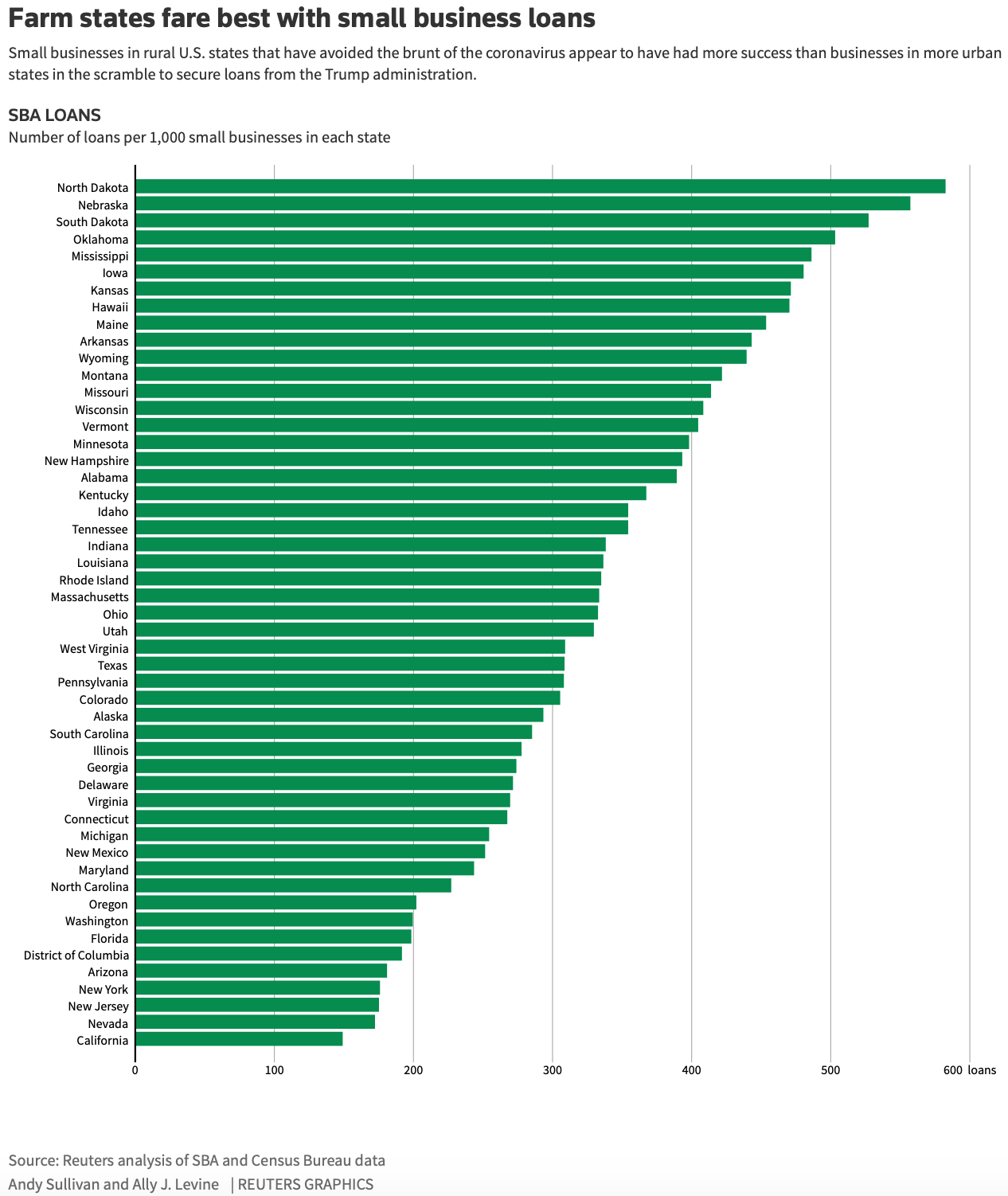 The three biggest state economies - California, Texas and New York - accounted for 23% of the loans, more than $82 billion. Meanwhile, businesses in a number of small, rural states that have avoided the brunt of the outbreak took home a disproportionate share of the pie.