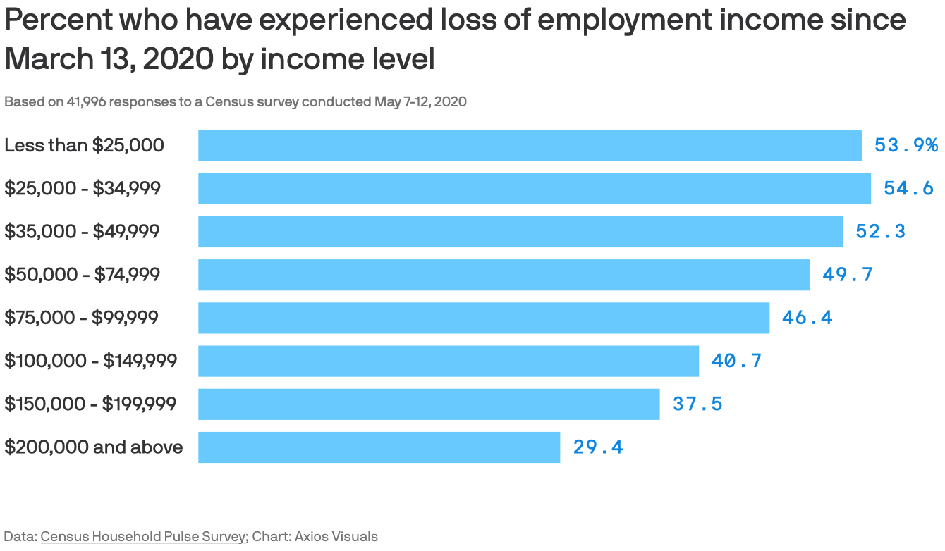The richest Americans are the least likely to say they've had income loss during the outbreak, according to the latest results from the U.S. Census Bureau's new weekly survey. (Axios)