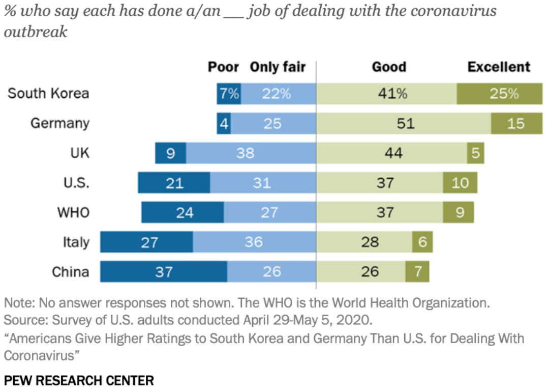 Americans give higher ratings to South Korea and Germany than U.S. for dealing with coronavirus. (Pew Research Center)