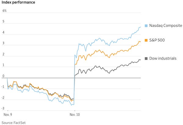 Dow Rises 1,200 Points on Signs of Easing Inflation: Stocks stage biggest rally since 2020 U.S. stocks had their biggest gains in more than two years, after softer-than-expected inflation data reignited bets that the Federal Reserve would slow the pace of its interest-rate increases. The Nasdaq jumped more than 7%, and Treasury yields had their steepest one-day declines in more than a decade. (Wall Street Journal)