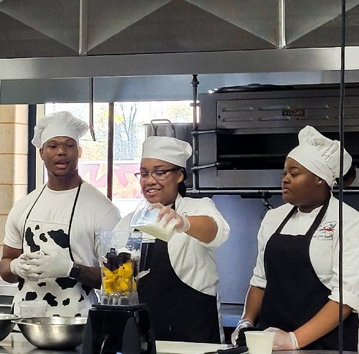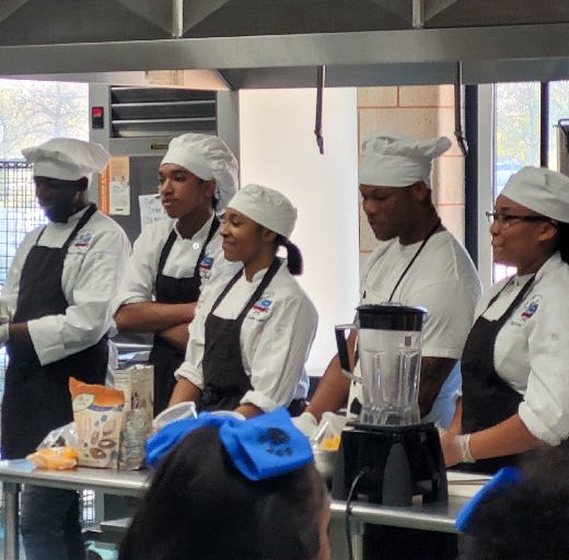 Bears running back David Montgomery participates in Simeon Career Academy cooking demonstration. (Chicago Tribune)