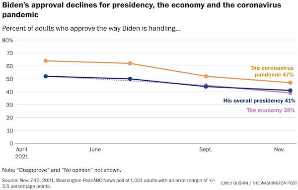 A new WaPo-ABC poll President Biden’s approval rating down to 41%, with 53% of respondents disapproving. The poll was conducted Nov. 7-10 — after the passage of the bipartisan infrastructure package (BIF). But the numbers for Biden get even worse than that: 63% of respondents said Biden has accomplished “not very much” or “little or nothing” so far in his presidency. A full 45% said he’s done “little or nothing” — that’s worse than the numbers for then-Presidents Trump, Obama or Clinton at comparable points in their presidencies. Just 31% said he’s kept most of his major campaign promises — also a worse figure than Trump, Obama or Clinton received. There’s also a tsunami warning for Dems: 51% of registered voters said they’d vote for the generic Republican congressional candidate if the elections were today. That is the highest number ever for Republicans in the 40-year history of this question being asked in this poll — higher than it was ahead of the GOP waves in 2014, 2010 or 1994. (Politico, Washington Post)