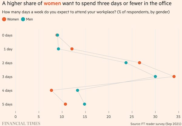 The FT published its “return to the office” survey, “as more than 1,000 readers — from London to Qatar — shared their concerns and hopes.” The survey put some data behind the trend I keep seeing: A significant post-Covid gap between men and women’s expectations about time spent at home and at the office.