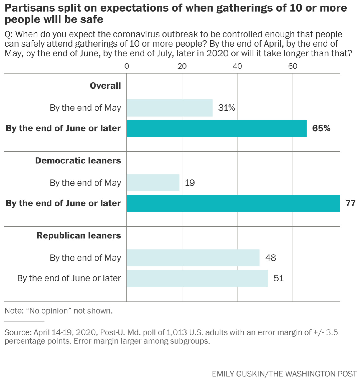 By contrast, 72 percent of Americans give positive ratings to the governors of their states for the way they have dealt with the crisis, with workers also rating their employers positively. And like so much else these days, it’s partisan. (Washington Post-University of Maryland poll)