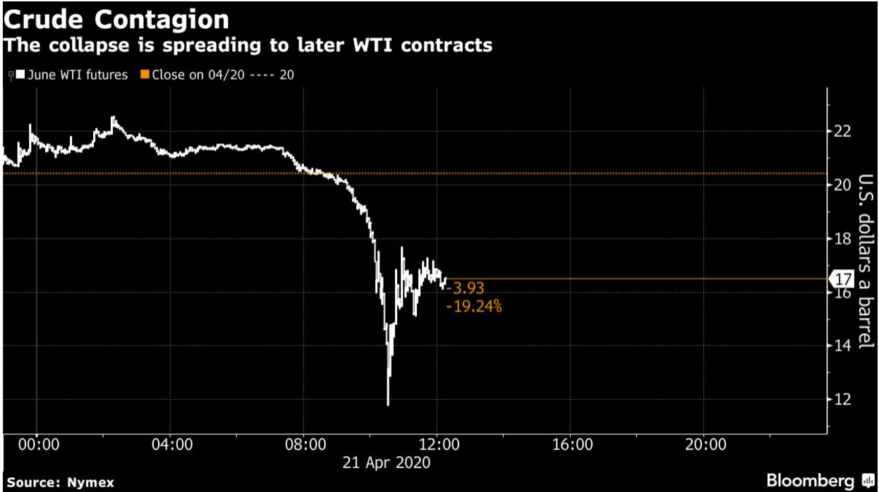 Oil continued its unprecedented sell-off on Tuesday, as June futures drop 30%. West Texas Intermediate’s June contract was halted three times early in New York to manage the volatility, CME Group Inc. said, highlighting the massive glut in the market causing the rout rather than any technical quirk.