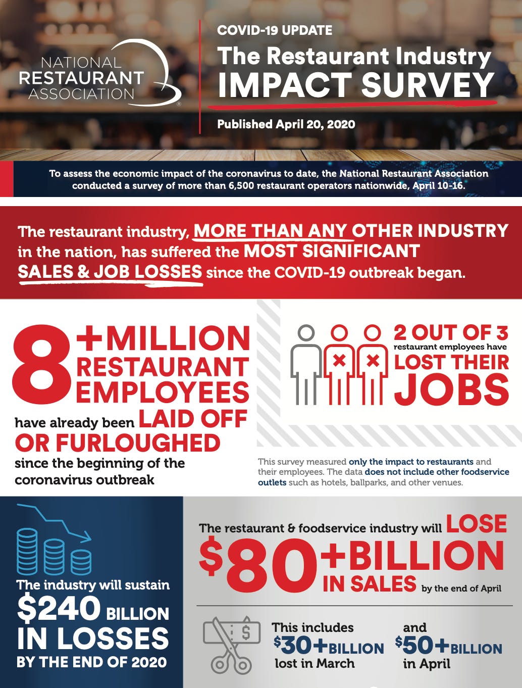 U.S. restaurants are on track to lose $240 billion by end of 2020. The restaurant according to an April 20 survey by the National Restaurant Association. The National Restaurant Association said the industry has lost two-thirds of its workforce: More than 8 million employees have been laid off or furloughed as four in 10 restaurants are closed. (Reuters, RestaurantDive)