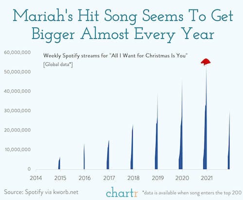 Mariah Carey’s "All I Want for Christmas Is You" is once again at the top of the Christmas hits list, racking up more than 30 million streams in the week ending December 9 — and that's just on Spotify. With every year that passes “AIWFCIY” seems to get a stronger claim to "biggest Christmas song of all time," growing along with the rise of streaming platforms. But why is the song so persistently popular? A musicologist offered their thoughts a few years ago, citing the chord progression, the emotional hook at the start and the suspense that builds into the final verse. (Chartr)