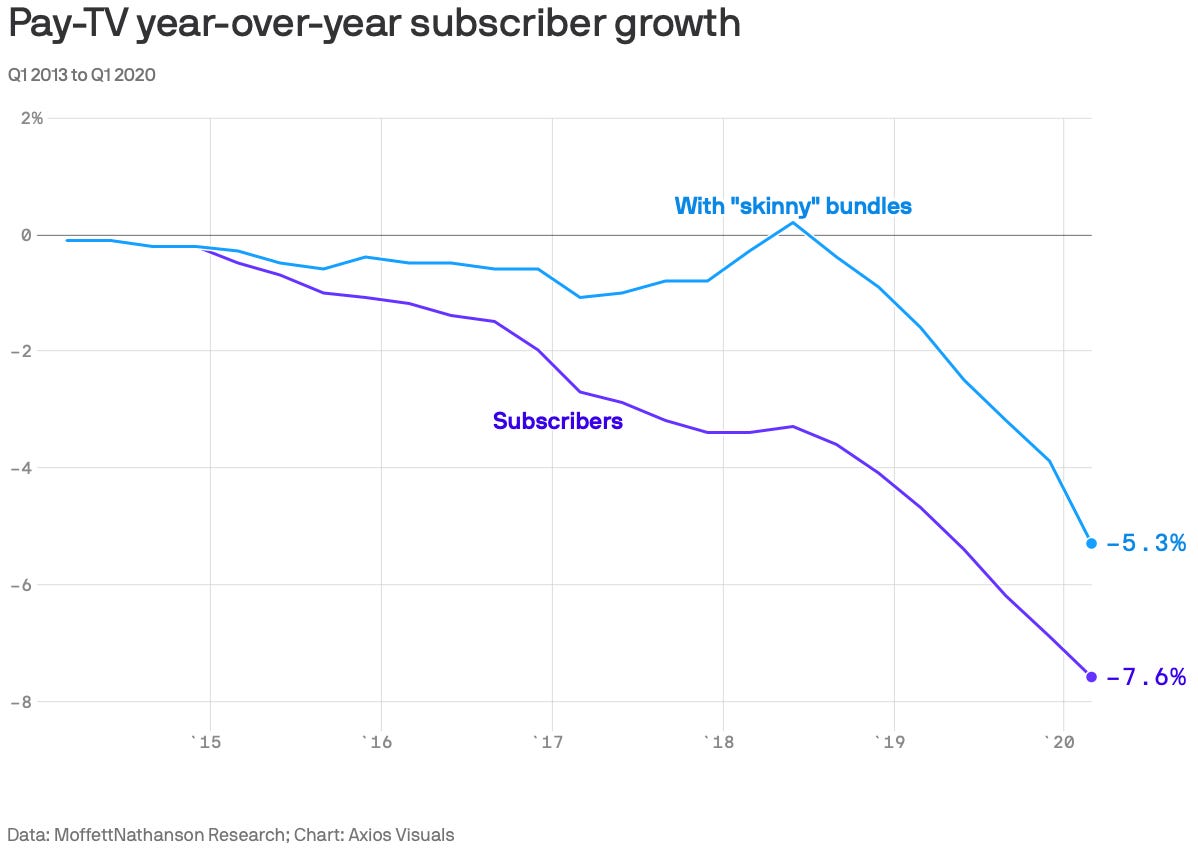 Disney will stream the Broadway blockbuster “Hamilton” on Disney+ service on July 3, a year before its planned theatrical release. Meanwhile, cord-cutting hit a record high as businesses reduced cable and satellite bills. (Wall Street Journal, Axios)