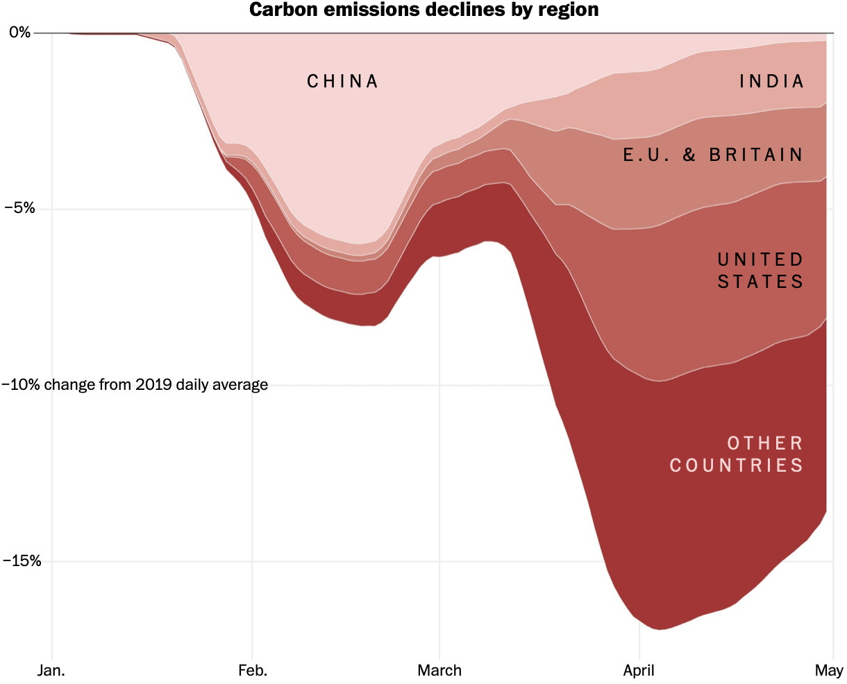 Global emissions plunged an unprecedented 17 percent during the coronavirus pandemic. But scientists say the drivers of global warming could quickly bounce back as social distancing ends and economies rebound. (Washington Post)