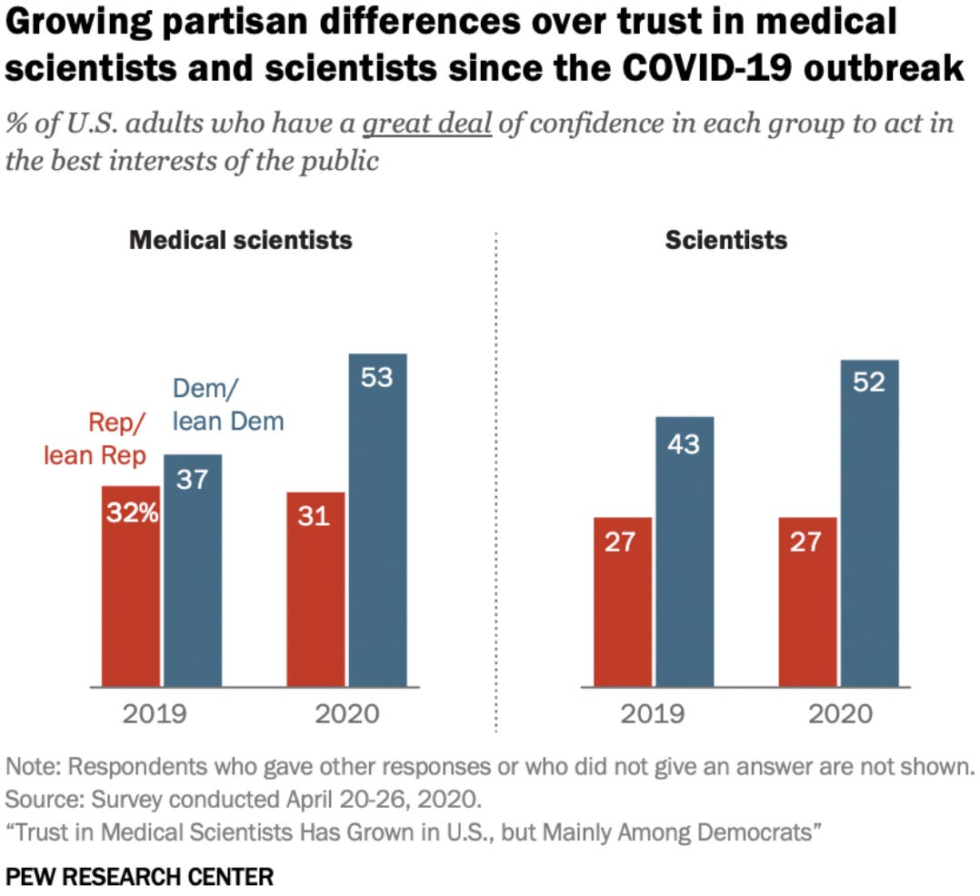 Americans’ confidence in medical scientists has grown since the outbreak began, as have perceptions that medical doctors hold very high ethical standards. But this increase in confidence has come primarily among Democrats, not Republicans. (Pew Research Center)