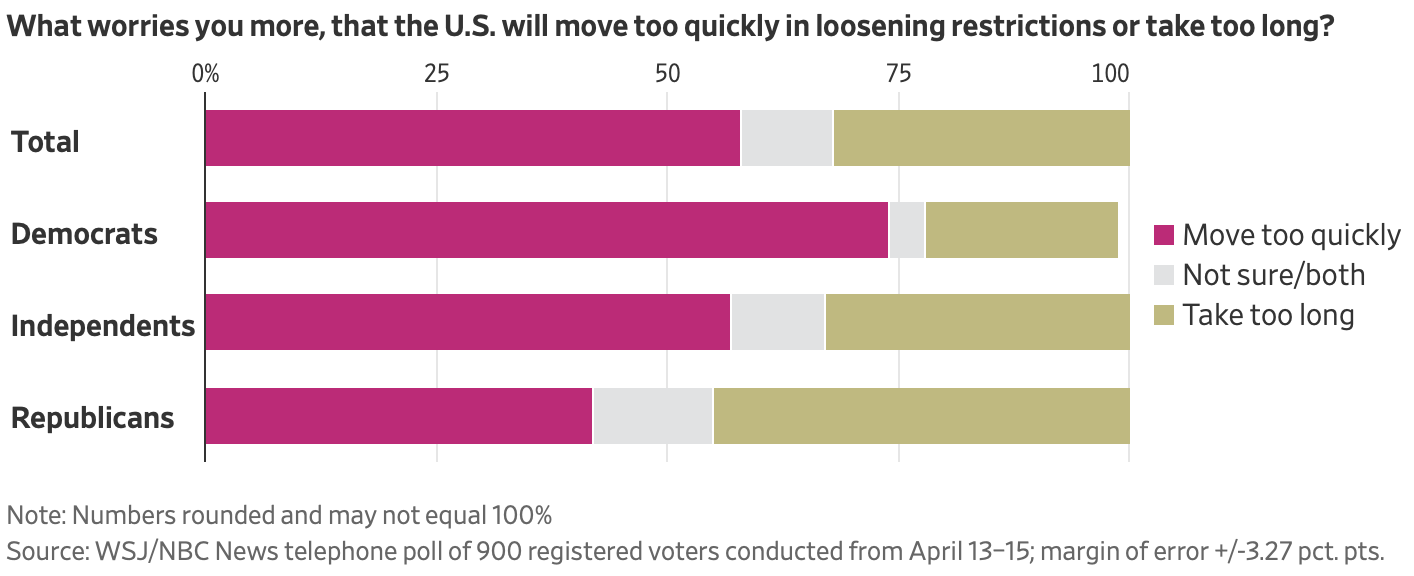 New WSJ/NBC Poll: More Americans fear lifting the coronavirus restrictions too soon. Nearly 60% of respondents worry that lifting stay-at-home orders quickly will fuel the pandemic. (Wall Street Journal)