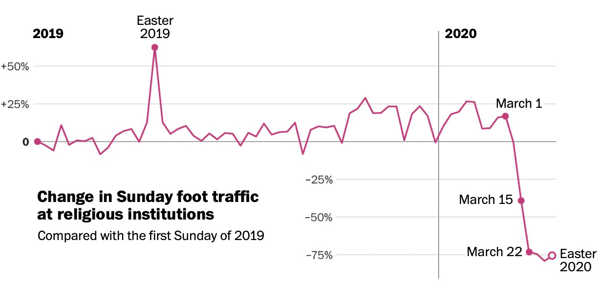 Cellphone data shows coronavirus kept churchgoers at home in every state on Easter (Washington Post):