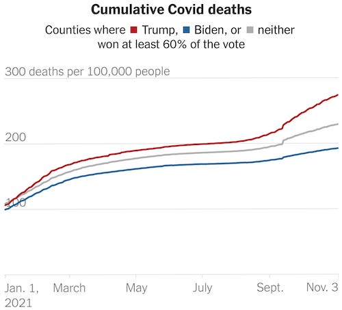 The gap in Covid’s death toll between red and blue America has grown faster over the past month than at any previous point, the NYT reports.