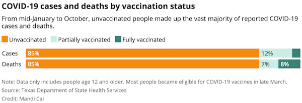 Unvaccinated Texans make up vast majority of COVID-19 cases and deaths this year. Out of nearly 29,000 Texans who have died from COVID-related illnesses since mid-January, only 8% of them were fully vaccinated against the virus, according to a report detailing the Texas Department of State Health Services’ findings. (Texas Tribune)
