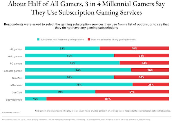 The subscription economy has officially infiltrated gaming: Half of the gaming market, including a strong majority of millennial gamers, say they pay for at least one service as industry shifts toward subscriptions. (Morning Consult)