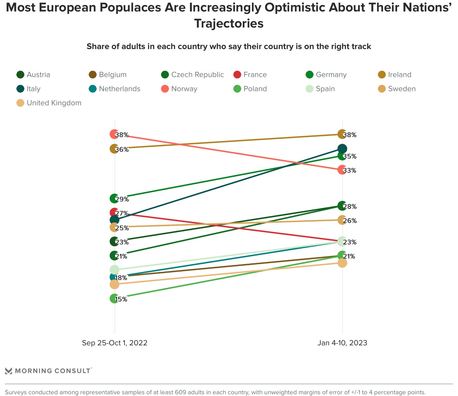 Optimism Rises in Most European Nations as Natural Gas Prices Fall: Europeans in 11 of 13 nations surveyed daily by Morning Consult have become more optimistic about their nations’ trajectories over the past three months, as a mild winter and continental coordination on natural gas supplies appear to have averted the worst potential outcomes. (Morning Consult)