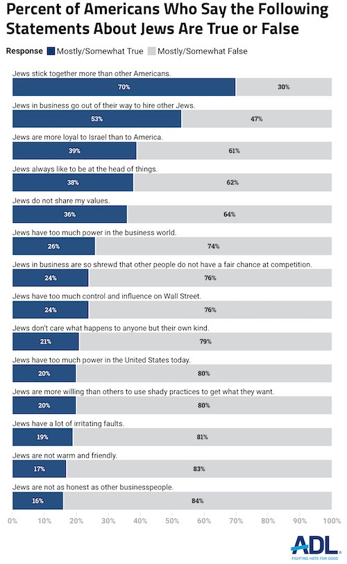 Belief of Americans in antisemitic conspiracy theories and tropes has nearly doubled since 2019, an Anti-Defamation League (ADL) survey showed on Thursday. The survey asked Americans how much they agreed with statements expressing anti-Jewish tropes or conspiracy theories and found that more than half of Americans believed at least one, the New York-based advocacy group said. About 85% of Americans believed at least one anti-Jewish trope, compared with 61% in 2019, the ADL said, adding that 20% of Americans believed six or more anti-Jewish tropes, substantially more than the 11% in 2019. (Reuters)