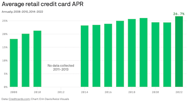 Retail credit card interest rates hit record high: The average annual percentage rate (APR) for a retail credit card is 26.72%, an all-time high. The average general-purpose credit card APR is 22.66%. 11 cards have maximum APRs of 30.74%, including Speedy Rewards Mastercard and Kroger Rewards World Elite Mastercard. (Axios)