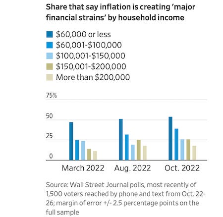 Inflation Strains Voters Across Income Levels Ahead of Midterm Elections: Lower-income Americans are feeling inflation’s impact the most, but top-earning households have become increasingly burdened. Among those with annual household incomes of more than $150,000 up to $200,000, 26% say rising prices are creating major financial strains, nearly double from the level in March. (Wall Street Journal)