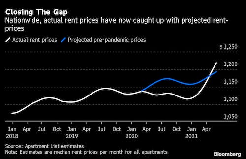 A tale of two rents: During the pandemic, rents in many big cities plunged. More than a year after cities went into lockdown, rents in the most expensive housing markets are rising, but they haven’t caught up to pre-pandemic projected prices — or what they would have been if the pandemic hadn’t happened. June 2021 rents in San Francisco are 16.2% lower than their pre-pandemic projections, for example. Nationwide, the story is different. The gap between actual and projected prices closed for the first time in May, and in most U.S. cities researchers looked at, rent prices are now similar to their pre-Covid estimates. (City Lab)