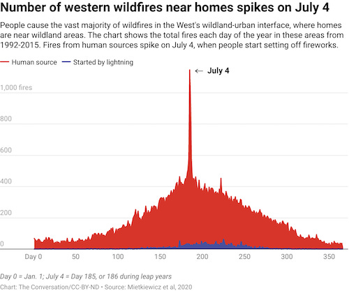 Humans start the most wildfires on July Fourth: For decades, one of the most striking and predictable patterns of human behavior in the western U.S. has been people accidentally starting fires on the Fourth of July. From 1992 to 2015, more than 7,000 wildfires started in the U.S. on July 4 – the most wildfires ignited on any day during the year. And most of these are near homes. (The Conversation)