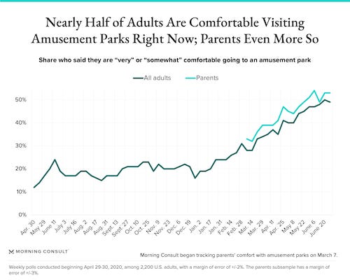 As consumers feel comfortable again, amusement parks could be in line for a busy summer. 49% of U.S. adults said they feel comfortable visiting an amusement park, while one-third said they’d feel comfortable heading to one in the next month. Millennials (55%) and members of Generation Z (58%) are most excited to return to amusement parks. (Morning Consult)