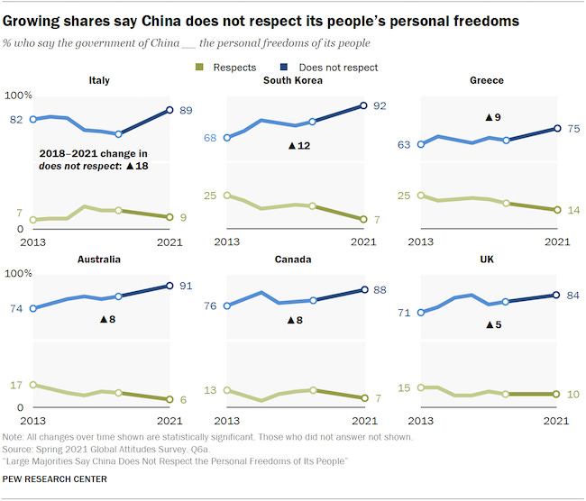 Large majorities say China does not respect the personal freedoms of its people. Unfavorable views of China also hover near historic highs in most of the 17 advanced economies surveyed. (Pew Research Center)