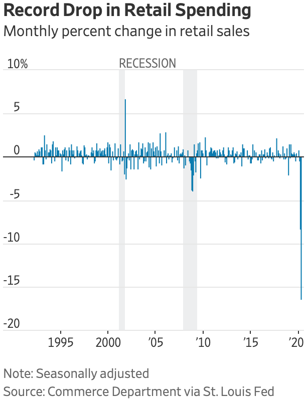Retail sales fell a seasonally adjusted 16.4% in April, eclipsing March’s 8.3% drop and marking the steepest month-over-month decline in records dating to 1992. The Federal Reserve said industrial production dropped 11.2% in April, its steepest monthly fall dating back more than a century. (Wall Street Journal)