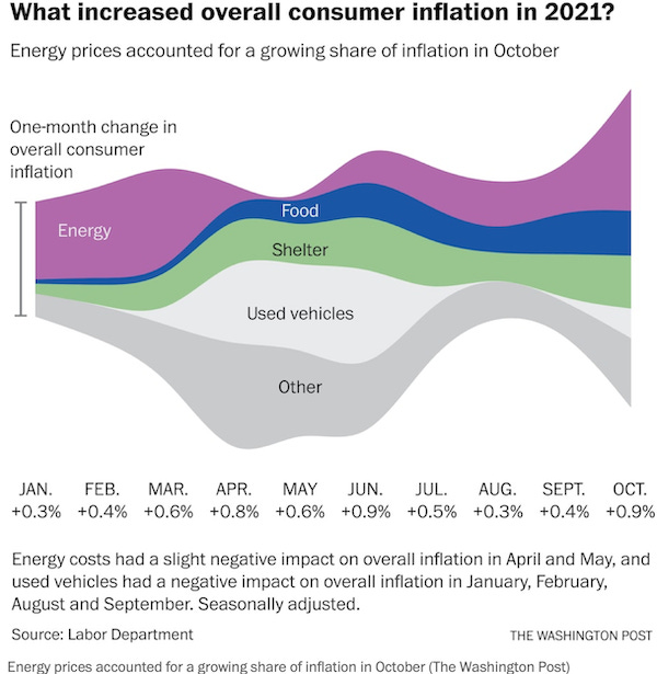 Joe Biden’s White House is scrambling to tame soaring inflation as rising prices threaten to undercut the US economic recovery, jeopardize his spending plans and doom the Democratic party’s chances in next year’s midterm elections. The fight against inflation marks a big shift in economic strategy for Biden compared with his early months in office, when the administration’s main goal was to revive the pandemic-hit US economy with a jolt in demand through fiscal stimulus. But battling high prices has now become a large focus for Biden’s economic team after incoming data have confounded its expectations that inflationary pressures would be shortlived. On Wednesday, the US consumer price index showed a 6.2% gain in October from the previous year, its fastest increase since 1990. (Financial Times, Washington Post)