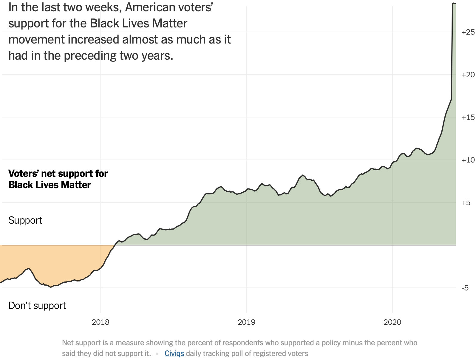 In the last two weeks, American voters’ support for the Black Lives Matter movement increased almost as much as it had in the preceding two years. (New York Times)