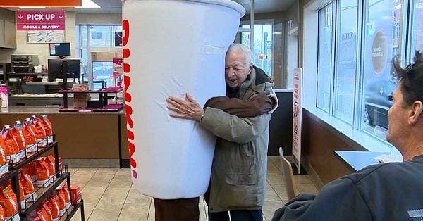 Dunkin' devotee surprised on his 95th birthday. He's been a "regulah" for about 40 years. (WCVB)