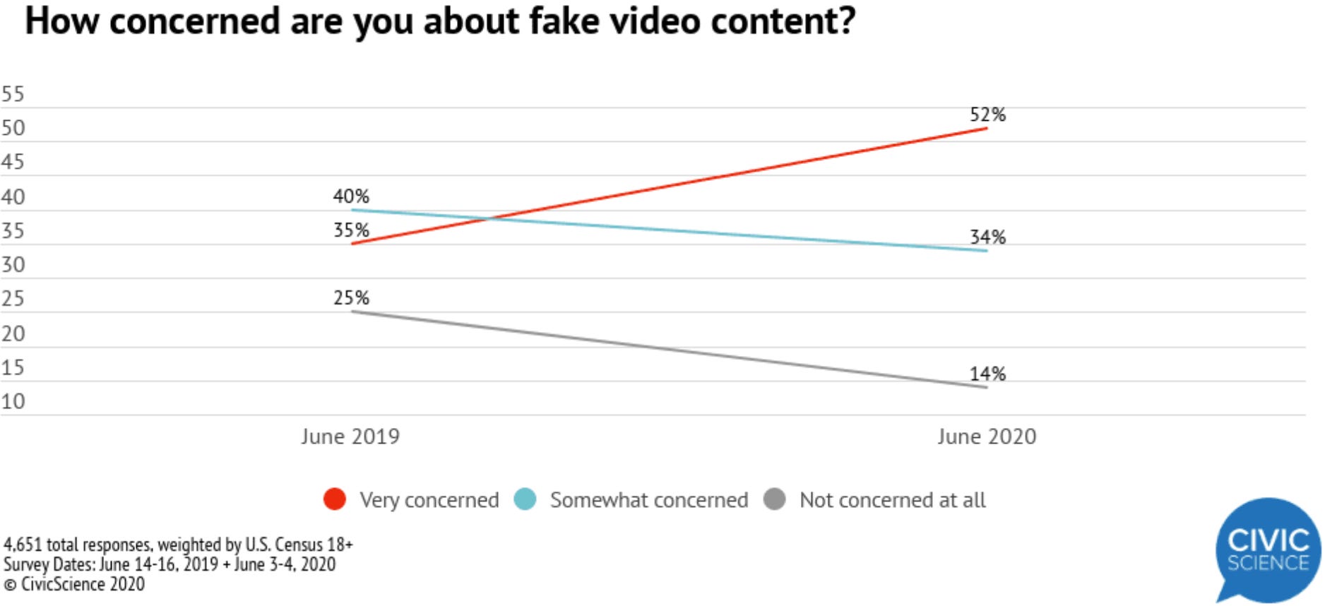 Fifty-two percent of U.S. adults say they are very concerned about fake video, up from 35% in June of 2019. (Civic Science)