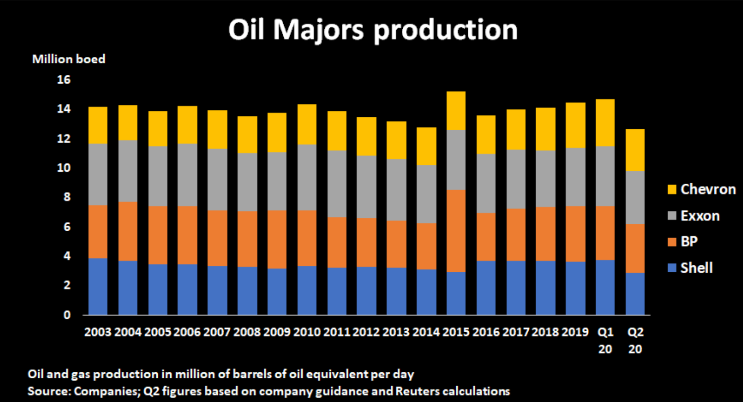 Oil and gas output from some of the world’s top oil companies is set to drop by over 12% in the second quarter of 2020 to levels not seen in at least 17 years. (Reuters)